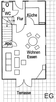 Im Erdgeschoß liegen der helle Wohnraum mit der davor liegenden großen SW-Terrasse, die separate Küche, ein kleiner Abstellraum, WC und Eingangsflur.