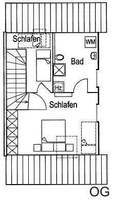 Im Obergeschoß befindet sich ein großes Schlafzimmer mit Doppelbett, einem großem Einbauschrank, Schreibsekretär mit Schubladen; ferner gibt es ein kleines Kinderschlafzimmer mit Einzelbett und zusätzlicher Liege, das Duschbad mit tiefer Duschwanne, WC und eine neue Waschmaschine.