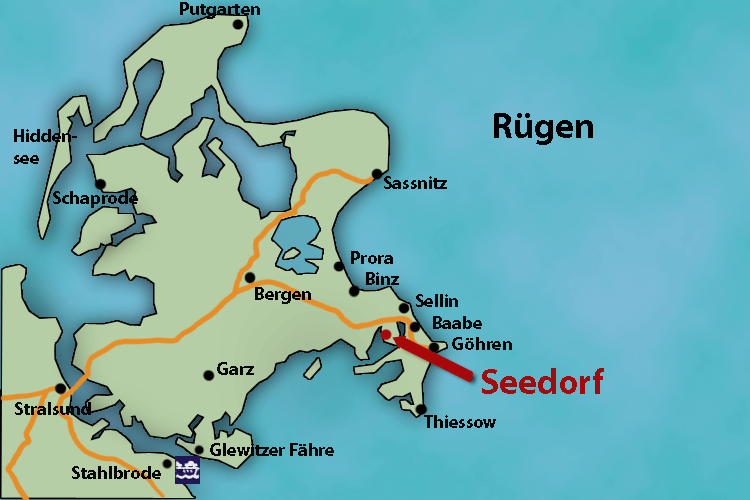 Obwohl Seedorf - wie die Karte zeigt - fast "am Ende der Welt" liegt, sind die Badeorte Sellin, Baabe, Göhren und auch das pulsierende Binz per Fahrrad, Bus oder Auto schnell erreichbar. Einen wesentlichen Teil Ihrer Lebensmittel für den täglichen Bedarf können Sie bei den regelmäßig kommenden Verkaufswagen erhalten, wie Backwaren, Fleisch- und Wurstwaren. Zudem gibt es eine Bäckereifiliale, die auch Milchprodukte anbietet sowie zwei Fischläden mit hervorragenden Fischangeboten zumeist aus eigener Verarbeitung. Fangfrischen Fisch und gute regionale Küche servieren Ihnen auch die drei schönen Gaststätten am Ort.
